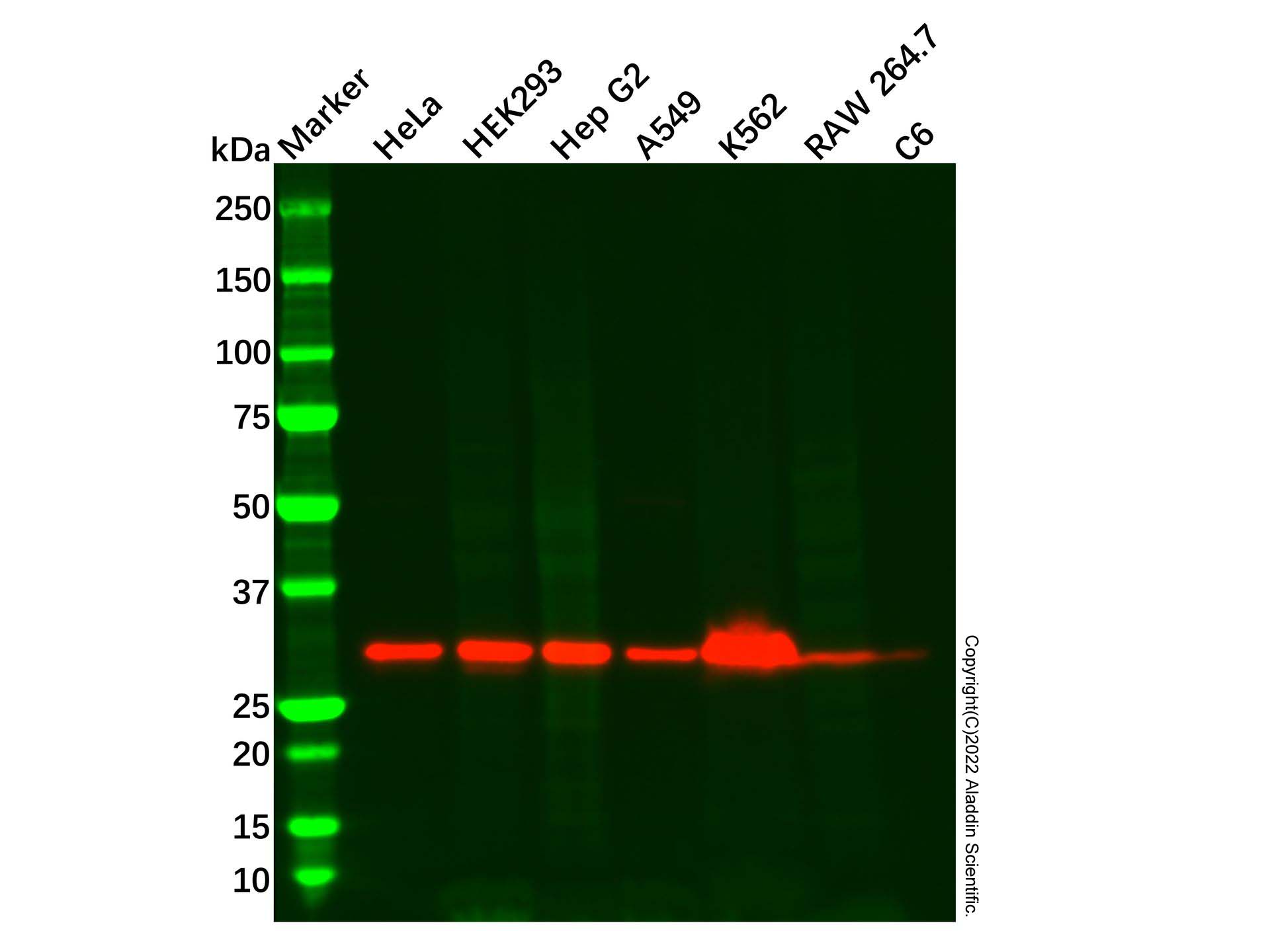| Positive Control | WB: HeLa, HEK293, Hep G2, A549, K562, RAW 264.7 and C6 cell lysates. IHC: Human tonsil tissue. ICC/IF: HeLa cells. |