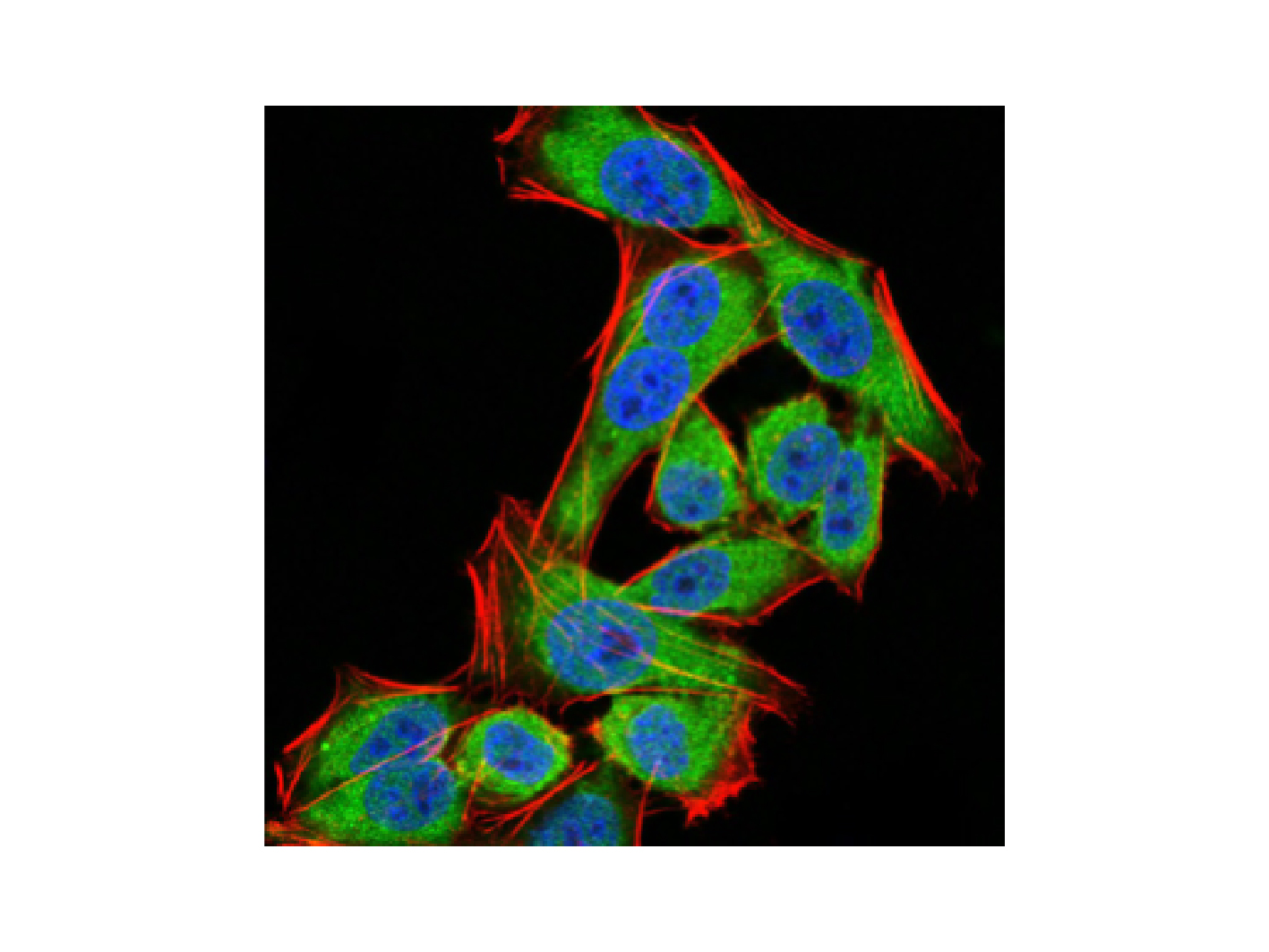 Immunofluorescence analysis of HeLa cells using PDPK1 Mouse mAb (Ab121091) (green). Blue: DRAQ5 fluorescent DNA dye. Red: Actin filaments have been labeled with AF555 phalloidin.