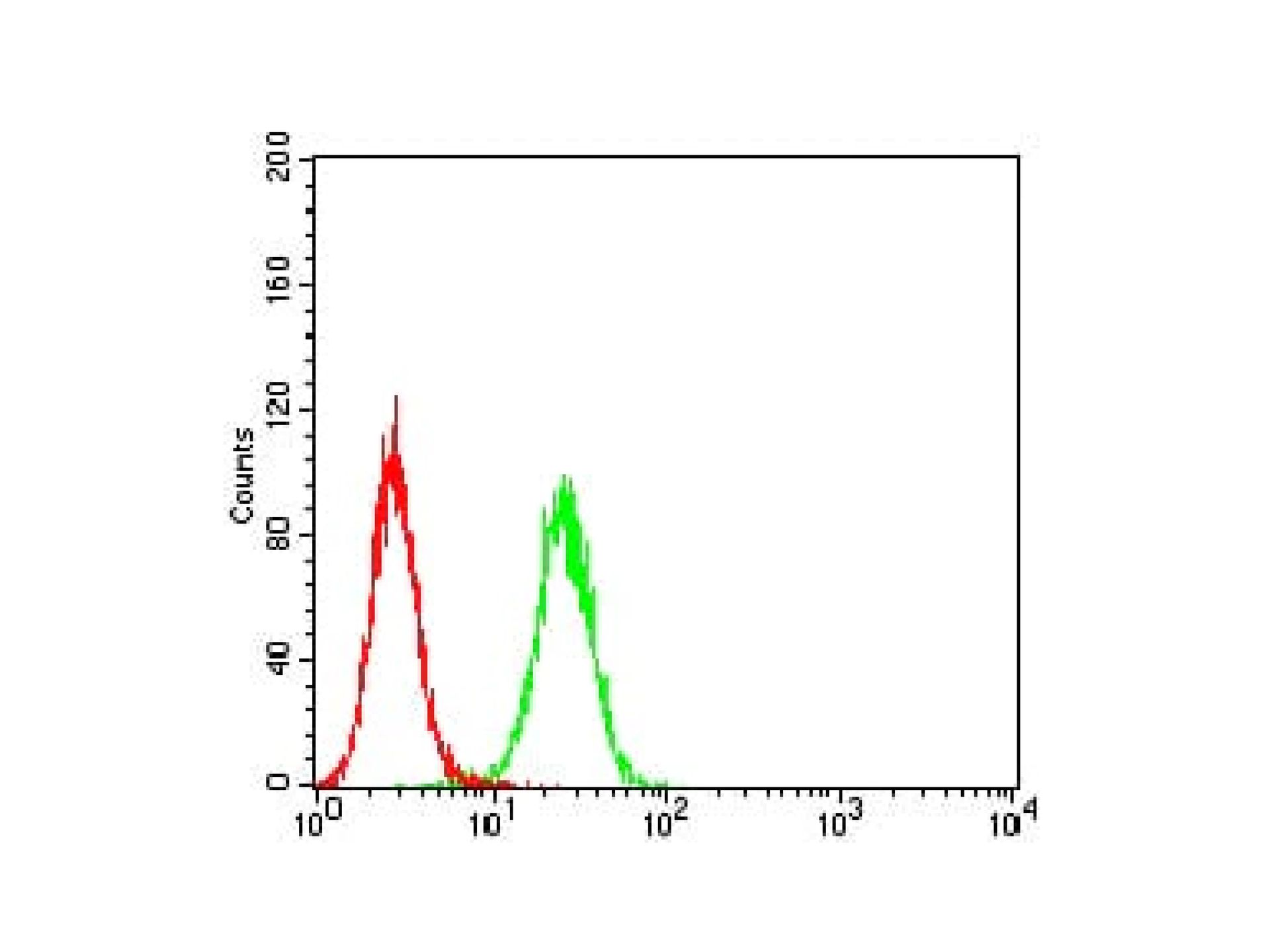 Flow cytometric analysis of HeLa cells using PDPK1 Mouse mAb (Ab121091) (green) and negative control (red).