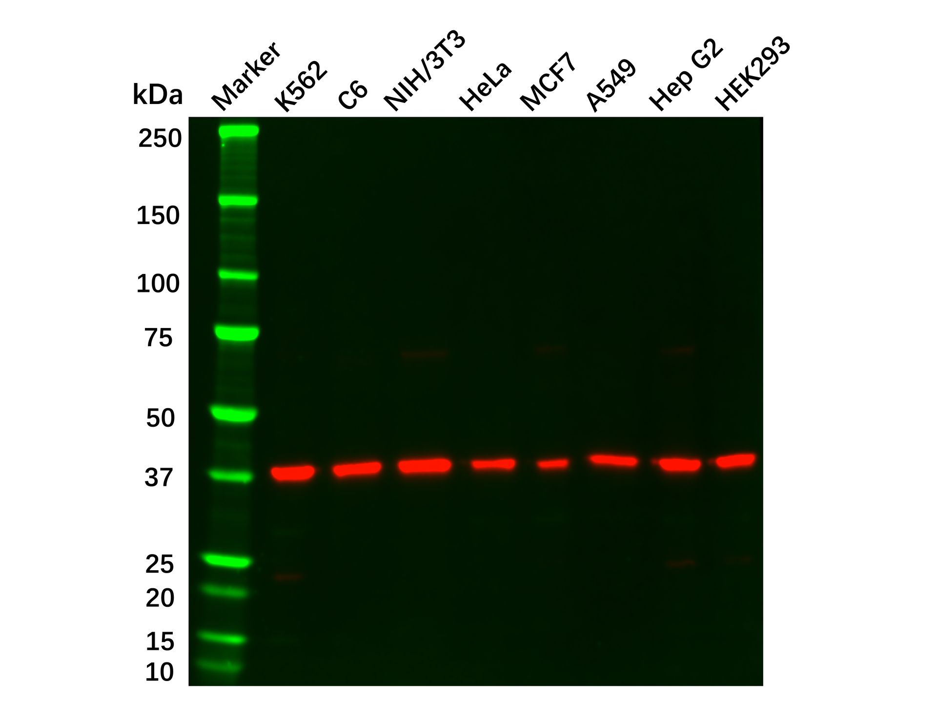 | Positive Control | WB: K562, C6, NIH/3T3, HeLa, MCF7, A549, Hep G2, HEK293 lysates. IHC: Human Cholangiocarcinoma Tissue. ICC/IF: K562 cells. |