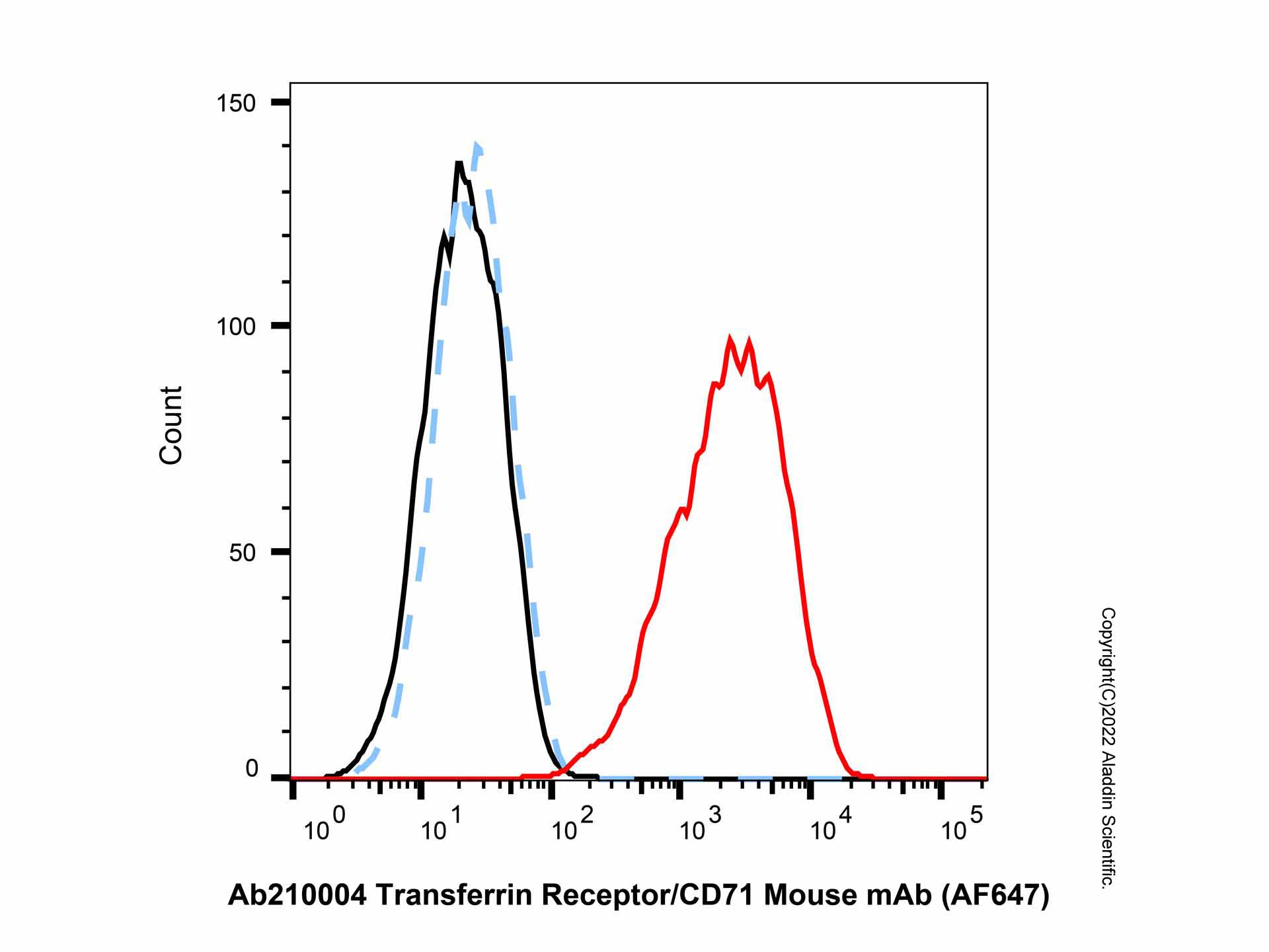 Flow cytometry analysis of Transferrin Receptor/CD71 expression by Jurkat cells (red) compared to an isotype control (blue). Cells were stained with Transferrin Receptor/CD71 Mouse mAb (AF647) (Ab210004) at 5μL/test for 1 hour at 4°C. Blue - Mouse IgG (AF647) (Ab190077). Black - Unlabelled control, cells without incubation with primary antibody.