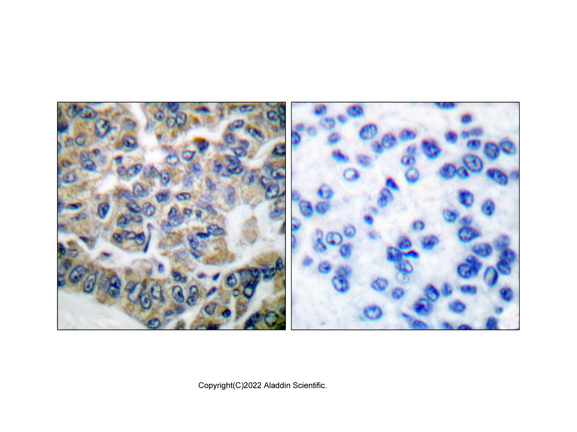 Immunohistochemistry analysis of paraffin-embedded human breast carcinoma tissue, using EEF2K Antibody (Ab101032). The picture on the right is blocked with the synthesized peptide.