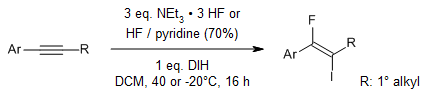 Utilizing 1,3-Diiodo-5,5-dimethylhydantoin(DIH) alongside HF-based reagents allows for a regio- and stereoselective iodofluorination of both internal and terminal alkynes. Additionally, a straightforward approach for achieving controlled regioselective double iodofluorination of terminal alkynes is introduced.