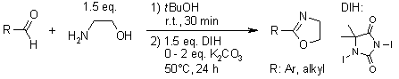 A range of aromatic and aliphatic aldehydes were efficiently transformed into their corresponding 2-aryl and 2-alkyl-2-oxazolines, respectively, in good yields through reaction with 2-aminoethanol and 1,3-Diiodo-5,5-dimethylhydantoin(DIH).