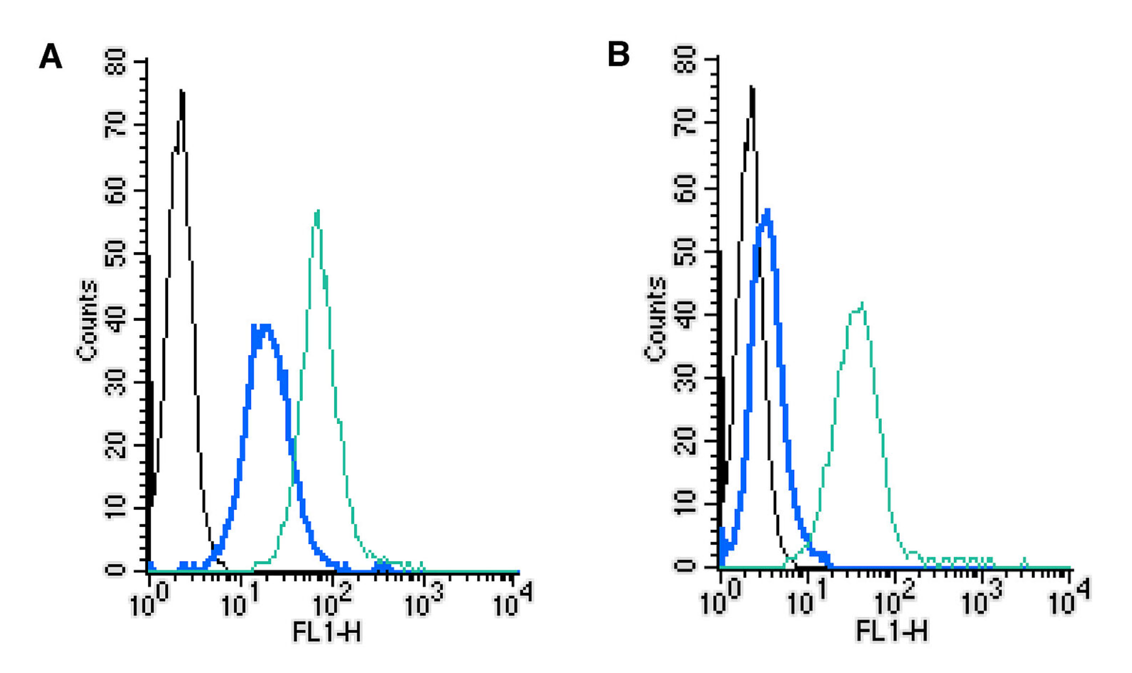 Image 5: Establishing the effectiveness of the Rabbit IgG Isotype Control-FITC (#RIC-001-F) control alongside cell surface detection of MERTK by direct flow cytometry in a live intact mouse J774 macrophage cell line. (A) The absence of an Fc block. (B) The presence of an Fc block. Black: unstained cells. Blue: cells + Rabbit IgG Isotype Control-FITC (#RIC-001-F), (2.5µg). Green: cells + Anti-MERTK (extracellular)-FITC Antibody (#ATR-033-F), (2.5µg).