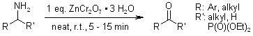 A rapid and efficient oxidative deamination reaction, facilitated by ZnCr2O7•3H2O under solvent-free conditions at room temperature, enables the synthesis of α-ketophosphonates from various α-aminophosphonates. This methodology also demonstrates its versatility in the rapid and highly selective oxidation of a wide range of amines to aldehydes and ketones, achieving excellent yields.