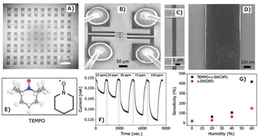 Figure 3: High performance H2S detector based on SWCNT network. a-d) SEM images of the assembled SWCNT device array; e) chemical structure of the TEMPO molecule; f) variation of the real-time current of the functionalized SWCNT sensor with H2S gas concentration; g) sensitivity of the unmodified SWCNT device and the TEMPO functionalized SWCNT device with humidity of the SWCNT devices [16].