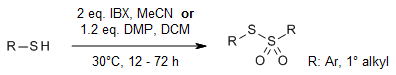 At room temperature, 2-Iodoxybenzoic acid (IBX) and Dess-Martin periodinane (DMP) can catalyze the transformation of thiols into thiosulfonates. Compared to IBX, DMP offers advantages in terms of faster reaction rates, higher conversions, and reduced equivalents needed. While IBX-catalyzed oxidation of benzyl thiols results in thiosulfonates, DMP leads to the formation of O-benzyl esters.