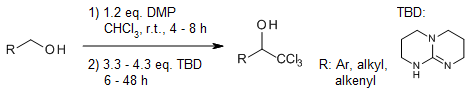 Primary alcohols can be converted into versatile trichloromethyl carbinols in a single-step process by treating them with Dess-Martin periodinane in CHCl3, followed by the addition of 1,5,7-triazabicyclo[4.4.0]dec-5-ene (TBD).