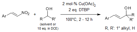 Utilizing di-tert-butyl peroxide as a radical initiator in conjunction with a copper salt as a promoter facilitates the synthesis of allylic alcohol, benzyl, and alkane derivatives through a radical mechanism. The C(sp3)-H bonds present in various alcohols, toluene derivatives, and alkanes were successfully alkenylated with β-nitrostyrenes, resulting in the desired products with high yields.