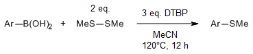 A metal-free coupling reaction between arylboronic acids and dimethyldisulfide efficiently produces aryl methyl sulfides. This method is straightforward, yields satisfactory results, demonstrates high functional-group compatibility, and operates under mild conditions.
