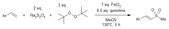 Employing inorganic sodium metabisulfite as a sulfur dioxide surrogate and di-tert-butyl peroxide as a source of methyl radicals facilitates a direct C-H methylsulfonylation of alkenes. This approach offers a straightforward route to (E)-2-methyl styrenyl sulfones with good yields.
