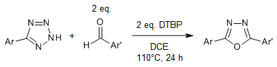 A metal- and base-free one-pot synthesis of 2,5-diaryl 1,3,4-oxadiazoles can be achieved through a radical-promoted cross-dehydrogenative coupling strategy. This involves N-acylation of aryl tetrazoles with aryl aldehydes, followed by thermal rearrangement. A wide variety of aryl tetrazoles and aryl aldehydes can be used to produce the corresponding products in good yields.