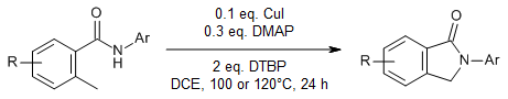 A copper-catalyzed sp3 C-H functionalization of 2-alkyl-N-substituted benzamides offers an effective method for synthesizing various functionalized isoindolinones, without the need for halogenated substitutes, expensive transition metals, or toxic Sn or CO gas.