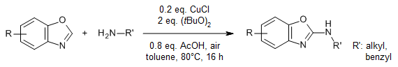 Copper-catalyzed C-H bond activation enables a facile, efficient, and simple protocol for direct oxidative C-H amination of benzoxazoles with primary amines using di-tert-butyl peroxide (DTBP) as oxidant under air. Various substituted aminobenzoxazoles were synthesized with very good yields.