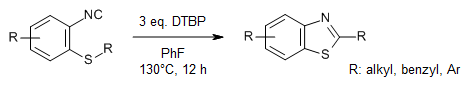 Triggered by alkyl radicals, a wide range of 2-isocyanoaryl thioethers, which include aliphatic, aryl, and heteroaromatic groups, can be cleaved and reinstalled precisely to produce benzothiazole derivatives. Mechanistic studies indicate that the cascade reaction follows an intermolecular pathway.