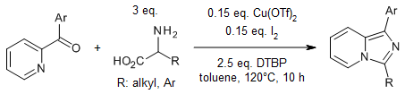 Using a copper/iodine cocatalyst system, the decarboxylative cyclization of α-amino acids with either 2-benzoylpyridines or 2-benzoylquinolines yields 1,3-disubstituted imidazo[1,5-a]pyridines and 1,3-disubstituted imidazo[1,5-a]quinolines in high yields.