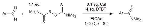 A straightforward approach for synthesizing aryl thioamides from aryl aldehydes and tetramethylthiuram disulfide (TMTD), utilizing CuI and di-tert-butyl peroxide (DTBP), eliminates the need for a sulfurating reagent. This method boasts a wide range of substrates, excellent yields, practical operability, and employs readily available and cost-effective raw materials.