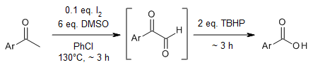 A metal-free and one-pot two-step synthesis of aryl carboxylic acids from aryl alkyl ketones has been performed with iodine as the catalyst, DMSO and TBHP as the oxidants. Various aryl alkyl ketones could be converted into their corresponding aryl carboxylic acids in very good yields.