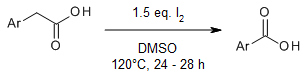 An I2-promoted direct conversion of arylacetic acids into aryl carboxylic acids under metal-free conditions involves decarboxylation followed by an oxidation reaction enabled just by using DMSO as the solvent as well as an oxidant. Notably, aryl carboxylic acids are isolated by simple filtration technique and obtained in good to excellent yields, which makes this protocol applicable for large-scale synthesis.