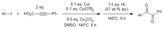 Benzil derivatives such as diaryl 1,2-diketones are synthesized via a direct copper-catalyzed decarboxylative coupling reaction of aryl propiolic acids with aryl iodides followed by an oxidation. The reaction shows good functional group tolerance toward ester, aldehyde, cyano, and nitro groups. In addition, symmetrical diaryl 1,2-diketones are obtained from aryl iodides and propiolic acid in the presence of palladium and copper catalysts.