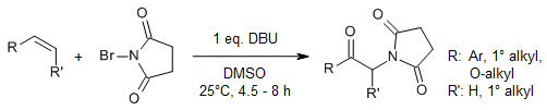 An oxo-amination process with readily available N-bromosuccinimide (NBS) and secondary amines as N-sources and dimethyl sulfoxide (DMSO) as the oxidant provides amino alcohols in a single step. For the first time, the formation of reactive Me2S+-O-Br species generated by the interaction of NBS with DMSO has been proven.