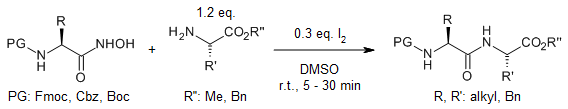 Formation of unstable but reactive acyl nitroso intermediates from Nα-protected hydroxamic acids in the presence of iodine and DMSO enables an efficient and straightforward coupling with an amino component to yield dipeptide esters.