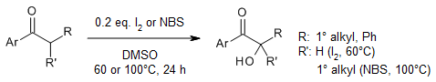 In an efficient α-hydroxylation of carbonyls compounds, readily available I2 or N-bromosuccinimide (NBS) was used as catalyst and DMSO as terminal oxidant. The reaction is mild, less toxic, easy to perform and allows the conversion of a diverse range of tertiary as well as secondary Csp3-H bonds.