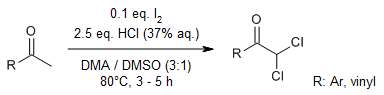 Methyl ketones can undergo dichlorination to afford α,α-dichloroketones in good yields with precise control of the chemoselectivity. Enabled by the I2-dimethyl sulfoxide catalytic system, in which hydrochloric acid only acts as a nucleophilic Cl- donor, this straightforward dichlorination reaction is safe and operator-friendly and has high atomic economy and good functional-group tolerance.