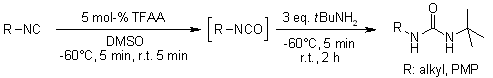 A smooth and efficient oxidation of isonitriles to isocyanates by DMSO as the oxidant is catalyzed by trifluoroacetic anhydride. The process is complete in a few minutes, forming dimethyl sulfide as the only byproduct. The newly formed isocyanates may be used directly or isolated in high purity by solvent evaporation.