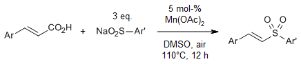 Reactions of cinnamic acids with aromatic sulfinic acid sodium salts in the presence of a catalytic amount of manganese(II) acetate tetrahydrate in dimethyl sulfoxide provide vinyl sulfones in very good yields. The use of DMSO as solvent and the presence of air are critical in achieving good yields.