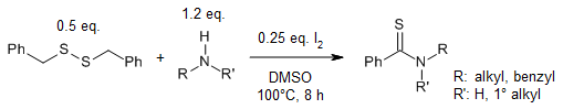 A metal- and additive-free reaction of 1,2-dibenzyldisulfanes with amines using iodine as oxidant and DMSO as solvent at 100°C provides various thioamides in high yields.