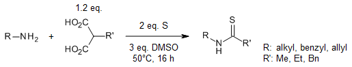 Malonic acid and derivatives can be used as C1 synthons via double decarboxylation promoted by sulfur and dimethyl sulfoxide. In the presence of amines as nucleophiles, a wide range of thioureas and thioamides as well as N-heterocycles were obtained in good yields under mild heating conditions.