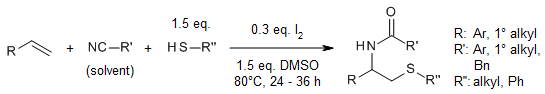 A direct difunctionalization protocol of alkenes with nitriles and thiols under metal-free synthesis conditions provides various β-acetamido sulfides with very good yields simply by using inexpensive molecular iodine as a catalyst, DMSO as a mild oxidant, and readily available thiols as thiolating reagents.