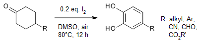 In a I2-catalyzed direct conversion of cyclohexanones to substituted catechols under mild and simple conditions via multiple oxygenation and dehydrogenative aromatization processes, DMSO acts as the solvent, oxidant, and oxygen source. This metal-free and simple system provides highly valuable substituted catechols for drug discovery.