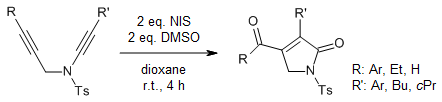 Dimethyl sulfoxide (DMSO) and N-iodosuccinimide mediate a metal-free regioselective 5-exo-dig oxidative cyclization of propargyl-substituted ynamides via in situ generated enol equivalents. The reaction allows easy access to functionalized pyrrolidone skeletons. The role of DMSO as oxidant in the transformation is clarified, and a tentative reaction pathway is proposed.