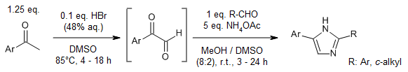 A ketone oxidation, employing catalytic HBr and DMSO, followed by imidazole condensation with aldehydes provides 2,4(5)-disubstituted imidazoles in good yields. A three-step synthesis of 20 kinase inhibitors was achieved by employing this oxidation-condensation protocol, followed by bromination and Suzuki coupling.