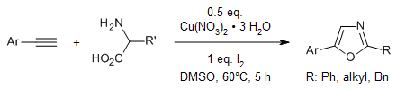 2,5-disubstituted oxazoles can be synthesized from easily available arylacetylenes and α-amino acids in the presence of Cu(NO3)2•3H2O and iodine. This reaction involves an I2/Cu(NO3)2•3H2O-assisted generation of α-iodo acetophenones, a Kornblum oxidation to phenylglyoxals, a condensation to imines, and a decarboxylation/annulation/oxidation reaction sequence.