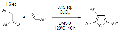 A copper-catalyzed oxidative cyclization of aryl ketones with styrenes to furans, in which DMSO serves not only as a solvent but also as an oxidant, provides multiaryl-substituted furans from cheap and readily available starting materials.