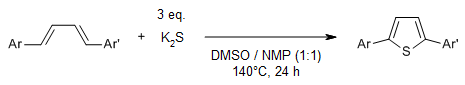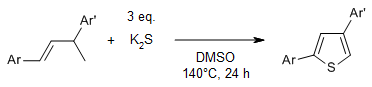 The reaction of substituted buta-1-enes with potassium sulfide enables an atom economical, and transition-metal-free synthesis of thiophenes via cleavage of multiple C-H bonds. Moreover, the strategy can also be used for the synthesis of thiophenes from 1,4-diaryl-1,3-dienes.