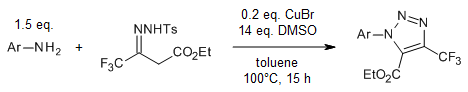 Copper catalyzes a rapid assembly of 5-carboxyl-4-perfluoroalkyl-triazoles from N-tosylhydrazides and perfluoroalkyl acetoacetates. The approach exhibits high functional group tolerance and can be executed on a multigram scale.