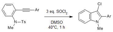 An intramolecular cyclization/chlorination of N,N-disubstituted 2-alkynylanilines provides a series of 3-chloroindoles with good yields using the DMSO/SOCl2 system. The incorporation of the chlorine atom is realized via a desulfonylative chlorocyclization process.