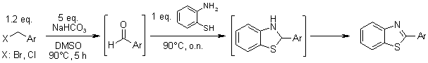 A one-pot tandem reaction of benzyl halides and o-aminobenzenethiol gives benzothiazoles in high chemical yields under mild conditions in DMSO in the absence of an additional oxidant. Both benzyl chlorides and bromides bearing a range of substituents proved to be suitable substrates.