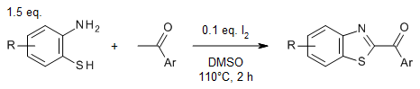 Iodine catalyzes simple and practical syntheses of 2-aroylbenzothiazoles and 2-arylbenzothiazoles from 2-aminobenzenethiols and acetophenones under metal-free conditions. Reactions in DMSO as oxidant and reaction medium provide 2-aroylbenzothiazoles, whereas the use of nitrobenzene as oxidant in dioxane as solvent enables the synthesis of 2-arylbenzothiazoles.
