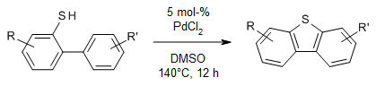 A simple catalytic system, in which PdCl2 is the sole metal catalyst and DMSO functions as an oxidant and solvent, enables a synthesis of dibenzothiophenes in high yields from 2-biphenylthiols. This transformation offers broad substrate scope and operational simplicity.