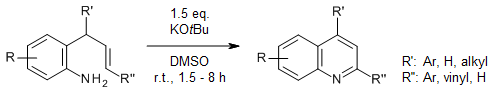 A regioselective 6-endo-trig intramolecular oxidative cyclization enabled an efficient synthesis of 2-aryl 4-substituted quinolines from stable and readily available o-cinnamylanilines with KOtBu as a mediator and DMSO as an oxidant at rt. The reaction showed a broad substrate scope with very good yields.