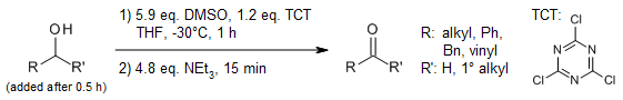 A mild and efficient alternative procedure for a quantitative conversion of alcohols into the corresponding carbonyl compounds uses dimethyl sulfoxide (DMSO), activated by Cyanuric chloride (TCT) instead of the toxic and moisture sensitive oxalyl chloride under Swern conditions.