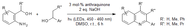 A visible-light-mediated oxidative cyclization of 2-aminobenzyl alcohols with secondary alcohols provides quinolines in good yields at room temperature. This photocatalytic method employes anthraquinone as an organic small-molecule catalyst and DMSO as an oxidant.