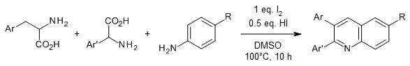 A practicable quinoline synthesis from aniline and two amino acids provides a wide range of quinolines with high efficiency and diversity including pharmaceutical derivatives, photochemical active compounds, and challenging scaffolds. Mechanistic studies revealed that I2 promotes decarboxylation, oxidative deamination, and selective formation of new C-N and C-C bonds.