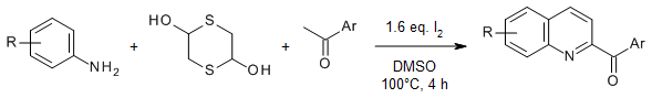 A highly efficient I2-promoted formal [4+2] cycloaddition enables the synthesis of 2-acylquinolines from methyl ketones and arylamines using 1,4-dithane-2,5-diol as an ethylene surrogate. This reaction occurred via an iodination/Kornblum oxidation/Povarov/aromatization sequence with an important role of the arylamine substrate in promoting the reaction.